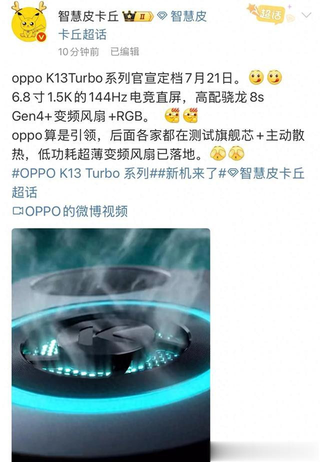 数码博主智慧皮卡丘爆料称,OPPO K13 Turbo系列正式官宣定档7月21日发布。新机最大亮点在于首次将“主动散热风扇”引入中端性能机型,搭配骁龙8s Gen4旗舰芯片与144Hz电竞直屏,试图打破性能机散热瓶颈,并引发行业跟进浪潮。